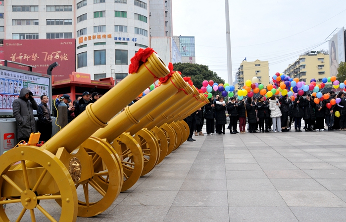 慶典儀式現(xiàn)場,八門金黃色禮炮一字排開,200余名員工代表手持彩球、面帶笑容整齊列隊。伴隨著歡快的《祝你生日快樂》樂曲,兩只喜慶的舞獅在廣場上歡樂的舞動著,現(xiàn)場氣氛喜慶熱烈。