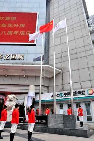 2020年1月1日,華億集團2020年新年升旗儀式暨華億國際購物中心18周年店慶慶典活動在步行街華億廣場隆重舉行。集團董事長項義水,總裁項領(lǐng),集團財務(wù)總監(jiān)劉建林,集團總裁助理陳雪榮,華億國際全體經(jīng)營班子成員,以及員工代表參加了慶典活動。華億國際副總經(jīng)理、旗艦店店總王萍女士主持慶典儀式。