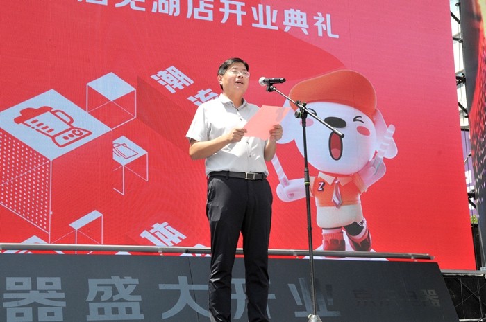 蕪湖市副市長姚凱,京東五星電器董事長潘一清,蕪湖市政府副秘書長潘楓,市商務局局長何紅旗,鏡湖區區委書記郝代偉,區委副書記、區長魯先貴,區委常委副區長徐江寶,安徽華億集團董事長項義水,長城資產安徽分公司經營二部總經理吳衛東,美的集團皖南運營中心總經理程龍泉,安徽華億集團總裁項領,京東五星電器皖南區域總經理楊閩儀出席開業儀式,并上臺為京東電器城市旗艦店蕪湖店啟動推桿。