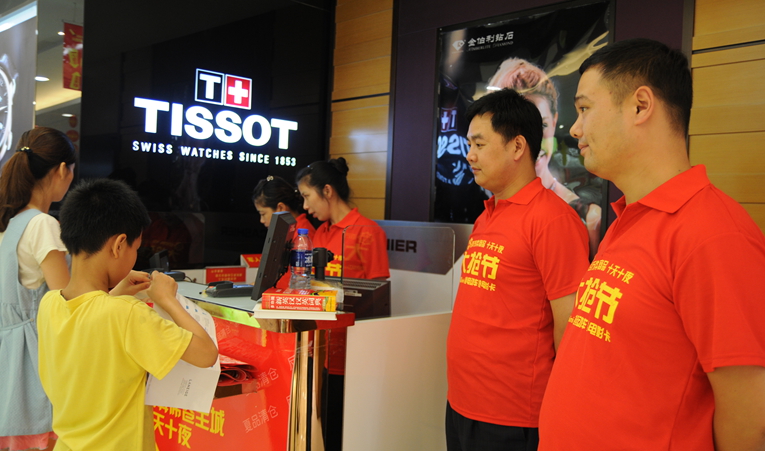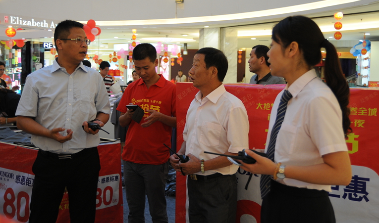 現場所有一線工作人員都換上了大紅色的工作服,上面標注著顯眼的“大搶節”字樣,方便工作人員之間的協調工作,更重要的是消費者可以隨時隨地找到華億員工咨詢幫忙。特別為這次活動添加的44 臺收銀機,早已擺放到位,調試完畢,兩座商場98臺收銀機,整機待發。華億集團其他戰線的近千名員工也輪番趕來支援,幫助維持秩序。70名專業安保人員分布在華億國際南北兩樓,巡邏查看和發放獎品等地重點蹲點結合,確保消費者“搶”的放心、舒心、省心。