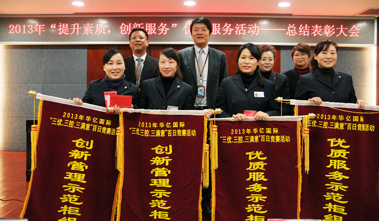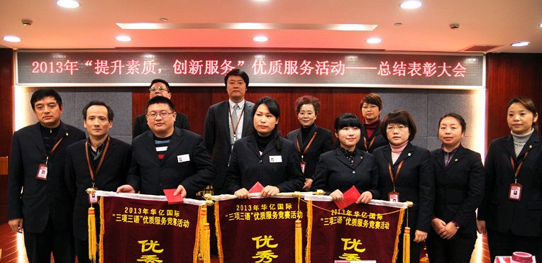 為提高華億國際服務品質,樹立公司良好的品牌形象。華億國際于2013年5月—12月在公司范圍內開展“提升素質,創新服務”相關系列服務競賽活動。在活動中,6名個人和18個集體表現出色,贏得了消費者的肯定,榮獲大會表彰。