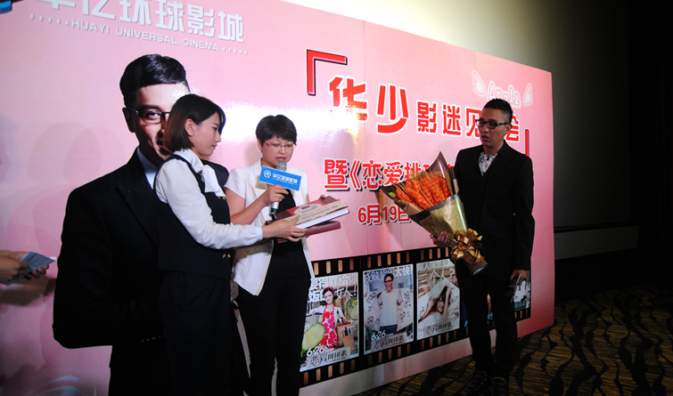 6月19日下午,“中國好舌頭”華少空降華億環球影城步行街店,為自己主演的首部爆笑愛情喜劇電影《戀愛排班表》宣傳站臺,并在華億環球影城舉行了獨家媒體群訪會,數百名影迷和媒體記者搶鮮觀賞了影片,并與華少親密互動。