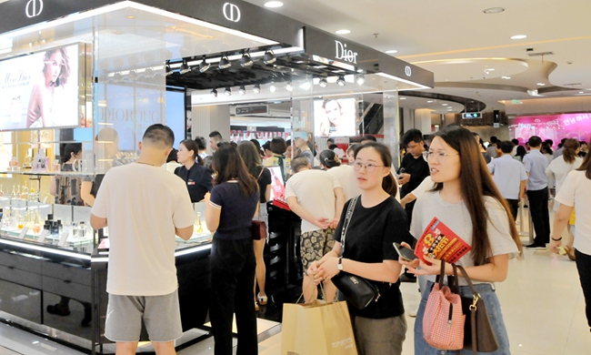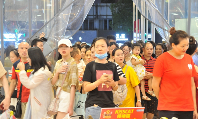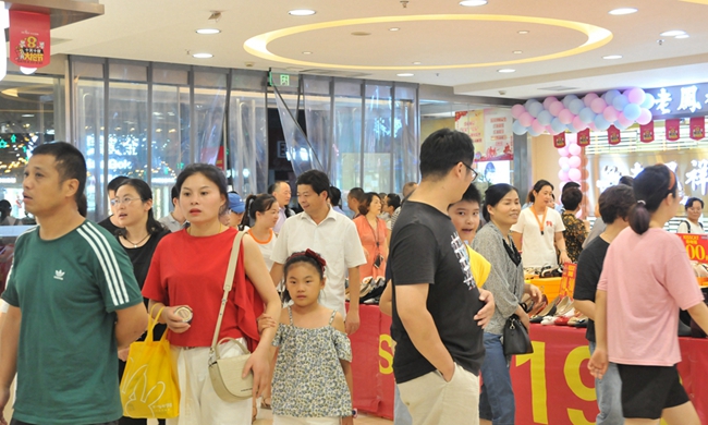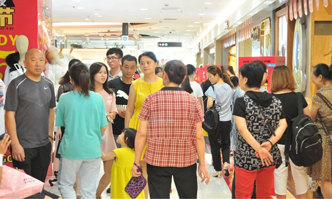 晚上7時,等候的人潮開始涌進商場,原本寬敞、靚麗的購物中心瞬間變得擁擠起來。放眼望去,商場通道內擠滿了來回穿梭的消費者,各大專柜內更是堆滿了琳瑯滿目的特價商品,人們幸福地挑選著商品,滿臉喜悅之情。