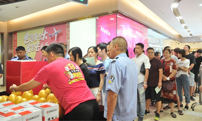 晚上6:30分,華億國際購物中心B座西門廣場客流不斷聚集,排隊等待入場,數名安保人員在門前維持秩序,玻璃門上掛著寫有“大搶節活動晚上7時開啟”字樣的KT板,提醒消費者正式進入商場的時間。熟悉活動的消費者都知道,這是華億國際“大搶節”活動開始前一小時進行閉門清場,這樣一個儀式感滿滿的活動設計從第一屆一直延續至今,成為“大搶節”活動的標簽之一。