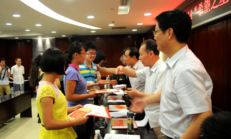 8月9日上午,蕪湖市愛心助學基金會2014年度“希望之星”華億獎學金頒獎儀式舉行。13位在今年中、高考中取得優異成績的學生及獲全國優秀少先隊員稱號的無為縣實驗小學學生丁浩然獲獎。