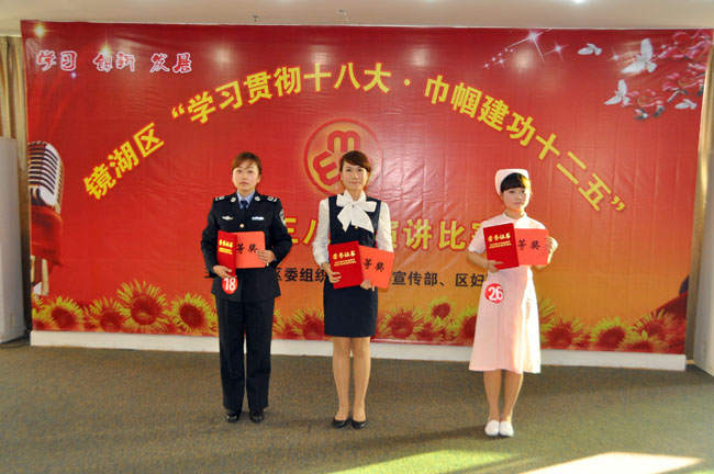 3月6日下午1點(diǎn)30分,由鏡湖區(qū)委組織部、宣傳部、婦聯(lián)舉辦的“學(xué)習(xí)貫徹十八大·巾幗建功十二五”慶“三八”演講比賽在皖江商務(wù)電子中心十二樓會議室內(nèi)進(jìn)行。此次演講比賽目的就是為了展現(xiàn)全區(qū)廣大女性貫徹十八大精神,立足本職崗位建功立業(yè)的風(fēng)采風(fēng)貌,激勵(lì)更多婦女弘揚(yáng)“四自”精神,敬業(yè)奉獻(xiàn),創(chuàng)先爭優(yōu)。